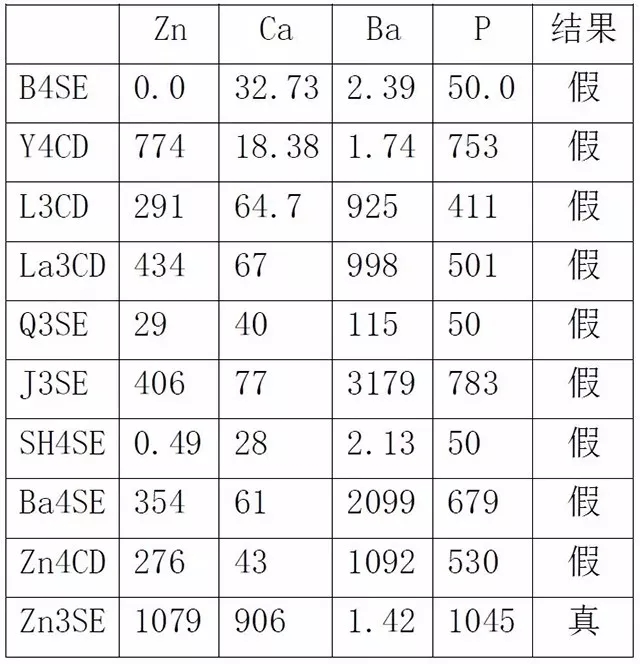 Ê×ÏÈÎÒÃǶÔÕæÓÍ·ÖÎöCa¡¢ Zn ¡¢Ba¡¢PËÄÔªËØµÄº¬Á¿£¬ÓÉ´Ë×÷Ϊ¼ø±ðÕæ¼ÙÓ͵ÄÒÀ¾Ý¡£¾ßÌåÊý¾ÝÈçÏÂ±í£º