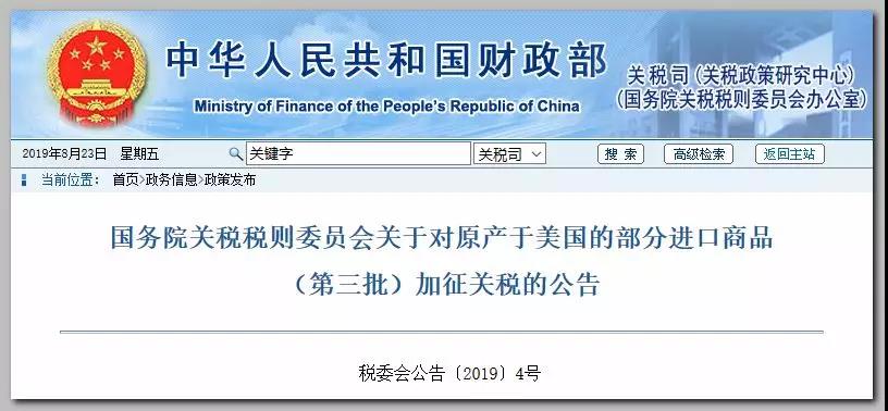 2019Äê8ÔÂ23ÈÕÍí£¬¹úÎñÔº¹ØË°Ë°ÔòίԱ»á°ì¹«ÊÒ·¢²¼¹«¸æ£¬Ðû²¼¶ÔÔ²úÓÚÃÀ¹úµÄÔ¼750ÒÚÃÀÔª½ø¿ÚÉÌÆ·¼ÓÕ÷¹ØË°¡£